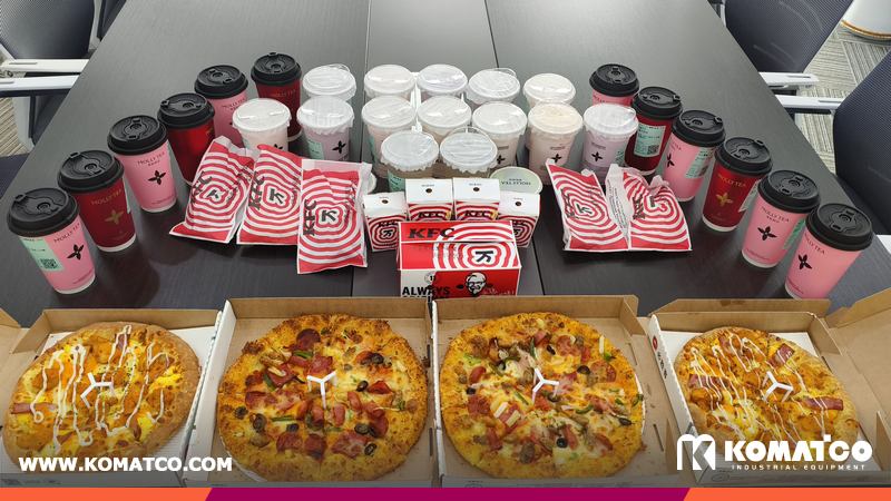 A variety of treats, including milk tea, pizza, and fried chicken, were thoughtfully arranged, filling the office with inviting aromas. Colleagues stepped away from their busy schedules to enjoy the moment, sharing food, exchanging ideas, and reconnecting in a relaxed setting. The cheerful atmosphere spread across the workspace, helping everyone recharge and refocus.